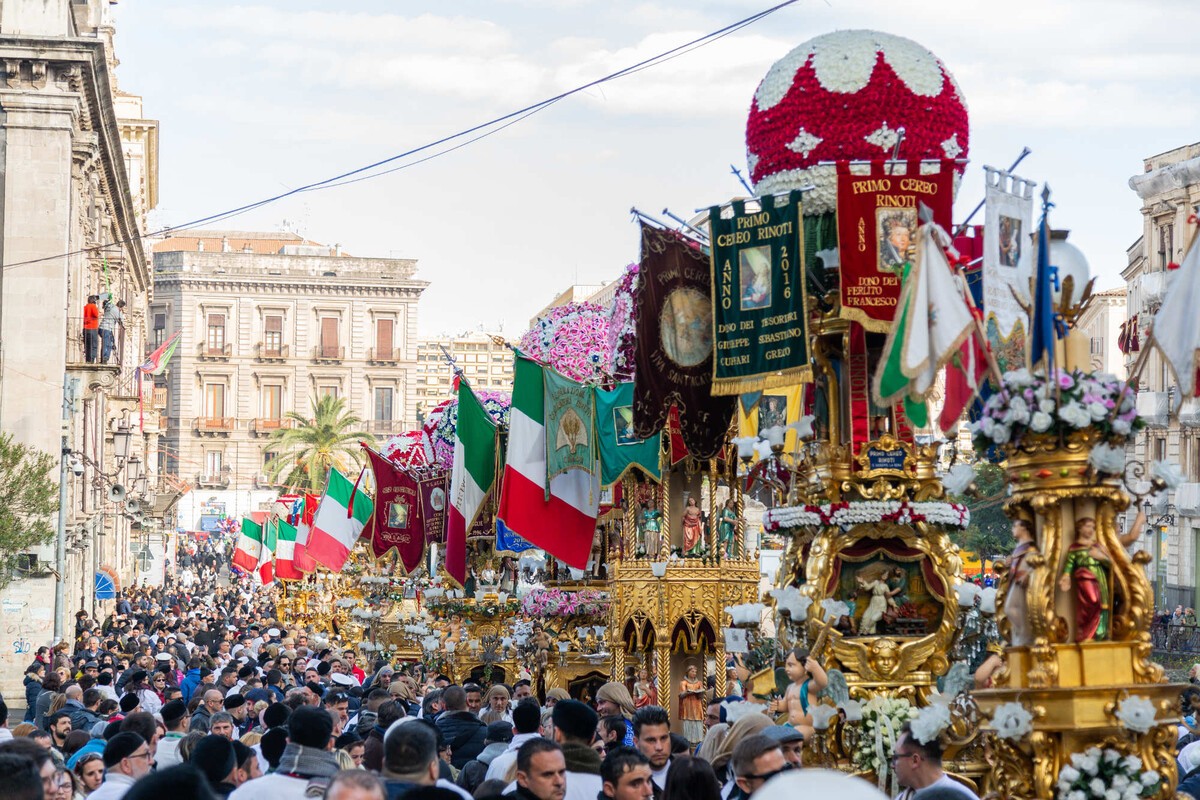 A Festa di Sant’Agata é uma das maiores celebrações religiosas da Sicília e homenageia a padroeira de Catânia, Santa Ágata, martirizada no século III por defender sua fé. Profundamente enraizada na história da cidade, a festa combina devoção, tradição e um forte sentimento de identidade local. Durante os dias de celebração, especialmente de 3 a 5 de fevereiro, milhões de fiéis participam das procissões que conduzem o relicário da santa pelas ruas. Vestidos de branco, os devotos acompanham o percurso em silêncio respeitoso ou em cantos emocionados, criando uma atmosfera impactante que mistura fé e memória coletiva.